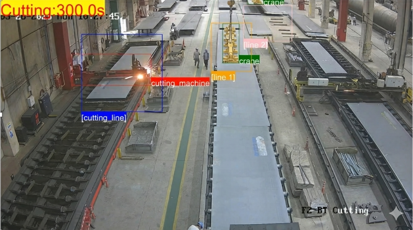 단순히 객체를 찾는 것을 넘어, VLM 기술을 적용하여 영상의 시간적 흐름과 맥락을 분석했습니다. VLM이 영상의 맥락을 이해하여 현재 공정이 '준비' 단계인지, '용접' 단계인지를 시간 순서대로 정확히 파악합니다. "크레인이 철판을 이동 중"이라거나 "용접 작업이 10분째 진행 중"과 같은 상황을 텍스트로 이해하고 설명할 수 있게 되었습니다. 이를 통해 공정 단계별 사이클 타임을 자동으로 산출하고, 작업 지연을 실시간으로 감지합니다.