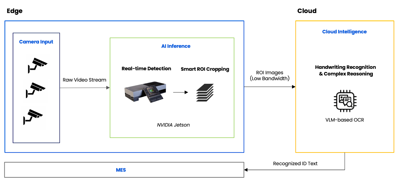 슈퍼브에이아이는 엣지 디바이스에서 전체 카메라 영상이 아닌, AI가 판단해야 할 영역(관심 영역(ROI 영역) 또는 텍스트가 있는 영역)만을 AWS 클라우드로 전송해 MES(제조 실행 시스템)와 연동하여, 대역폭을 절약하면서도 실시간성을 보장하는 효율적인 하이브리드 엣지-클라우드 아키텍처를 완성했습니다.