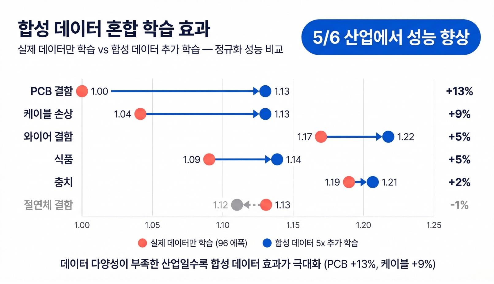 시사점: 학습량(compute) 증가만으로는 데이터 다양성의 한계를 넘을 수 없으며, 합성 데이터가 이 병목을 구조적으로 해소합니다. 6개 산업 중 5개에서 합성 데이터 추가가 학습량 증가보다 효과적이었습니다.