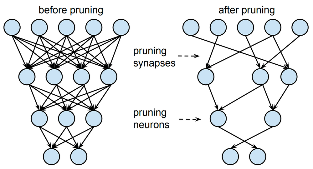 - 가지치기 (Pruning): 중요하지 않은 가중치를 제거하여 모델의 연결 수를 줄이고 계산량을 감소시키는 방법.