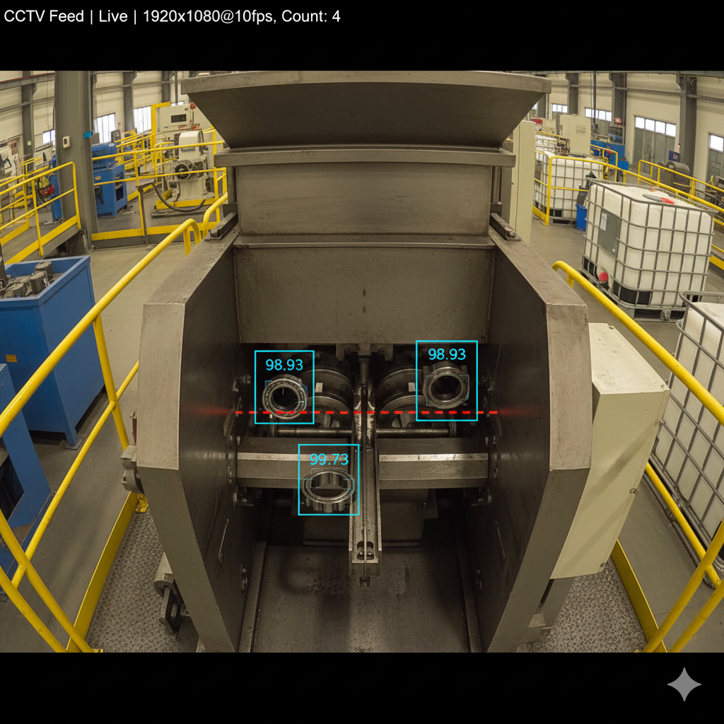 고가의 신규 설비 도입이 아닌, I사가 이미 보유한 기존 CCTV 영상 및 보급형 산업용 카메라를 활용하여 AI 모델을 적용해 빠르고 효율적인 도입이 가능했습니다. 시스템은 생산 라인에서 제품(금속 단조품 등)이 낙하하는 순간을 실시간 분석하여, 딥러닝 모델이 각 객체를 '탐지'하고 '추적'하여 정확한 수량을 '카운트'합니다.