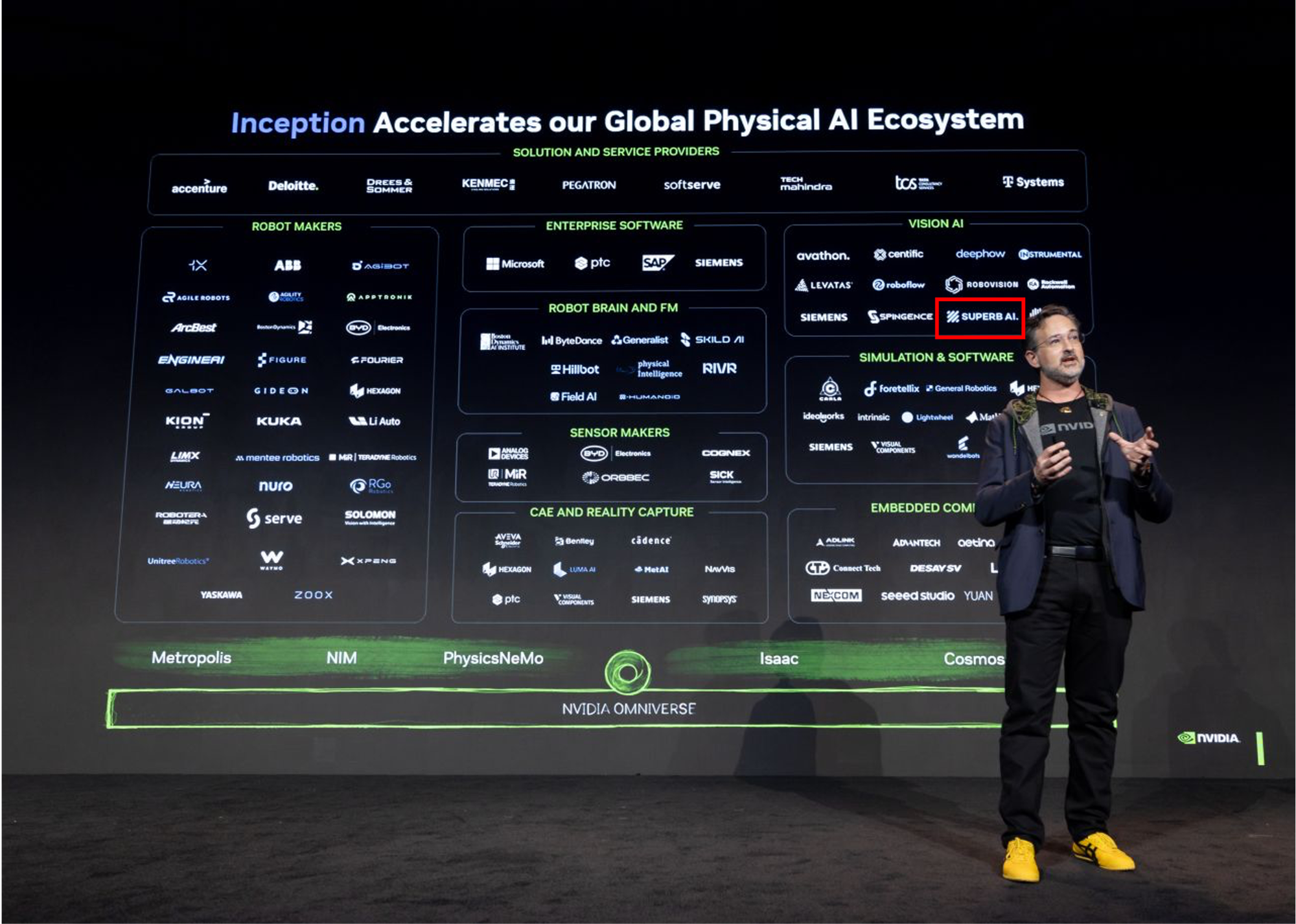 - Vision AI (시각 지능): 로봇에게 세상을 보는 '눈'과 이를 해석하는 능력을 제공하는 분야로, 슈퍼브에이아이가 엔비디아의 핵심 파트너로 위치해 있습니다. 슈퍼브에이아이는 로봇이 수집한 시각 데이터를 처리하고, 자동 라벨링 및 큐레이션을 통해 AI 학습 효율을 극대화하며, 상황의 맥락을 이해하는 고차원적 인지 능력을 지원합니다.