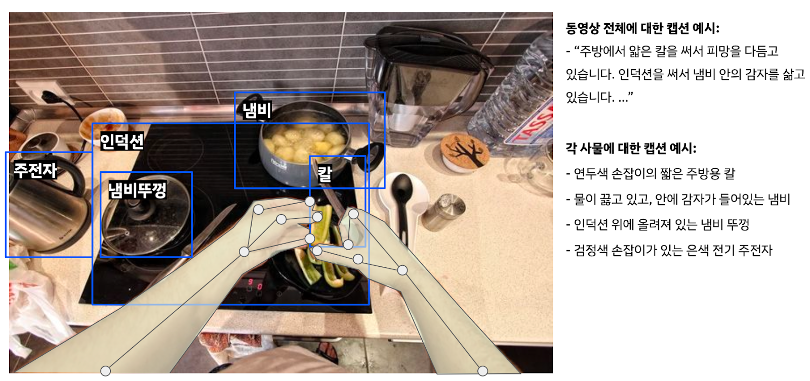 슈퍼브에이아이는 영상에 "사람이 컵을 잡았다"라는 단순한 설명 대신, "물을 마시기 위해(의도) 오른손으로 투명한 유리컵의 손잡이를 잡았다(구체적 행동)"와 같이 행동의 맥락과 인과관계를 포함한 상세한 캡션을 달았습니다. 이를 통해 AI는 단순한 동작뿐만 아니라, 그 행동이 왜 일어나는지를 학습하여 사람의 의도를 파악하게 됩니다.
