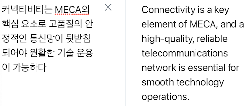 - 파파고 번역문 - Connectivity is a key element of MECA, and a high-quality and stable communication network must be supported to enable smooth technology operation
