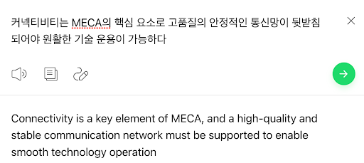 - 한국어 원문 - 커넥티비티는 MECA의 핵심 요소로 고품질의 안정적인 통신망이 뒷받침되어야 원활한 기술 운용이 가능하다.