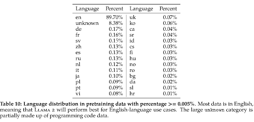 이는 LLaMA2에 활용된 언어별 훈련 데이터의 분포를 보면 명확해진다. 훈련 데이터의 무려 89.7%가 영어인 반면에, 한국어는 고작 0.06%에 불과한 것을 알 수 있다. 최근에는 NIA(한국 정보화진흥원)과 스타트업 업스테이지가 '한국어 리더보드'를 공동 개설해 운영하는 등 한국어 데이터셋 확보를 통한 한국어 특화 LLM의 개발을 촉진하는 등 다양한 시도들이 계속되고 있다.