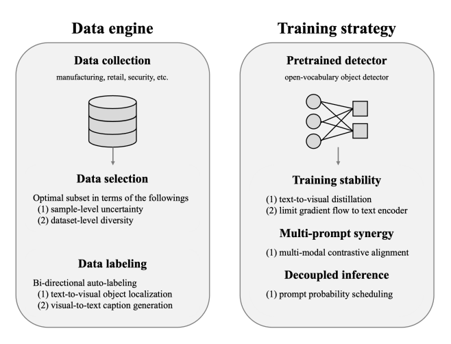 기존의 파운데이션 모델은 재학습 없이는 특정 산업 분야에 바로 적용하기 어려웠습니다. 제로는 텍스트와 이미지를 동시에 이해하는 멀티모달 프롬프트(Multi-modal Prompts) 방식을 활용하여, 별도의 학습 없이도 다양한 산업 현장의 객체를 정확하게 탐지하고 이해할 수 있습니다.